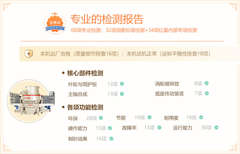 報(bào)告表明:第五代環(huán)保節(jié)能制砂機(jī),經(jīng)過(guò)重重嚴(yán)格檢測(cè),各核心零部件均達(dá)標(biāo),且環(huán)保能力強(qiáng),符合綠色制砂標(biāo)準(zhǔn),同時(shí)耐用度高,設(shè)備壽命更長(zhǎng)、故障率低;另外,設(shè)備日常運(yùn)行平穩(wěn),可全天24小時(shí)連續(xù)作業(yè)無(wú)障礙,制成的砂子粒型美觀、級(jí)配合理、細(xì)度模數(shù)可調(diào),在市場(chǎng)上擁有更高價(jià)值。